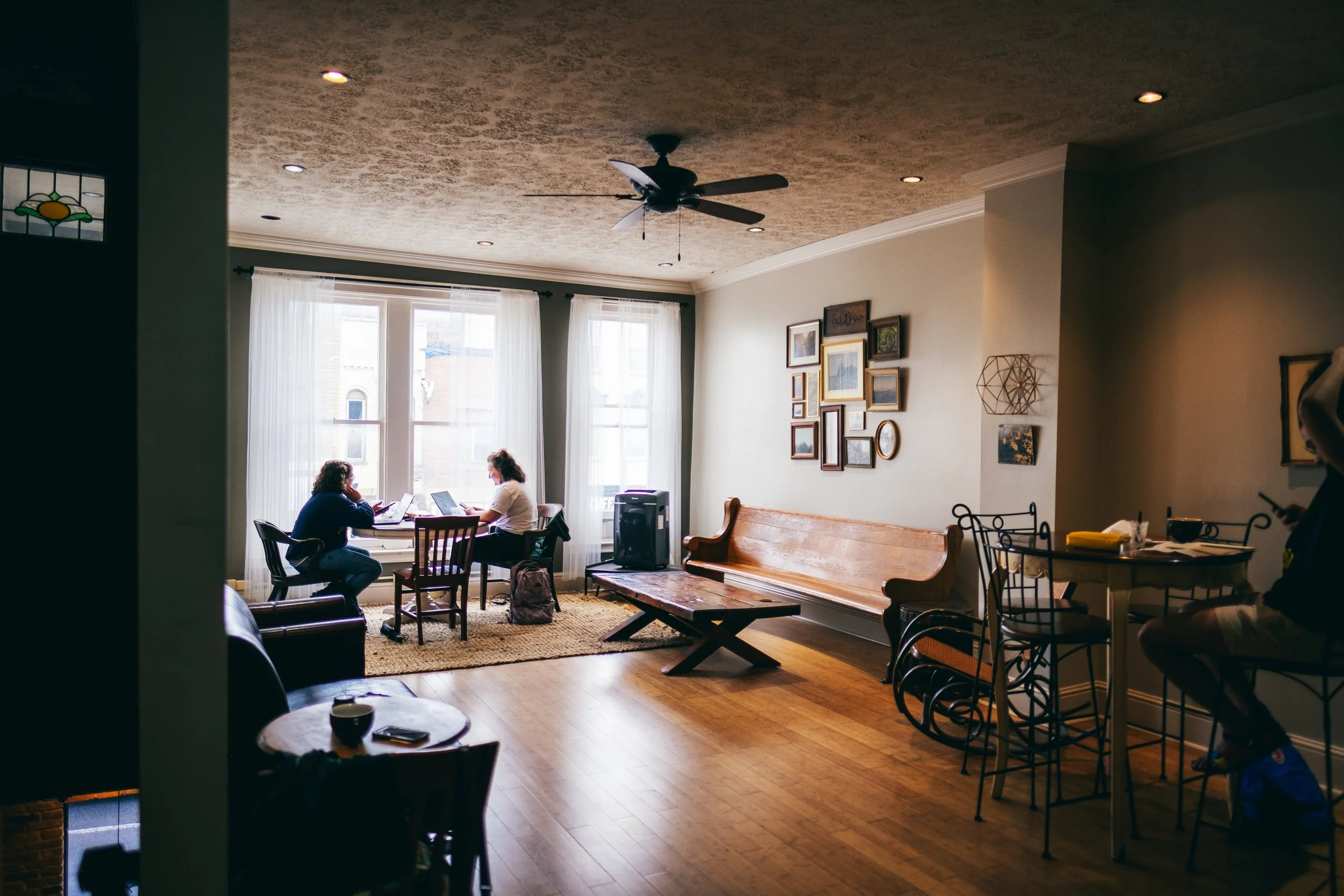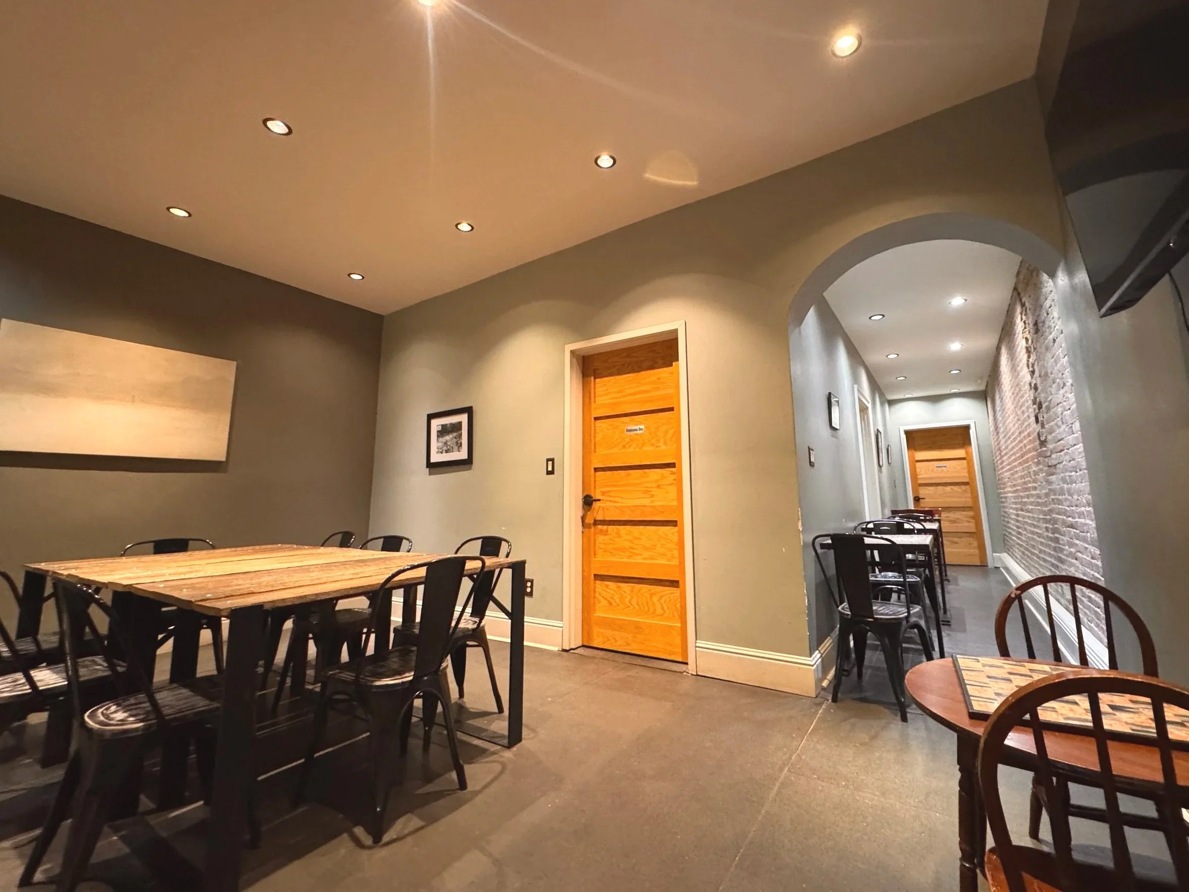 Our conference room is located adjacent to our upstairs dining area. Furnished with large tables and comfortable chairs, this space is perfect for hosting your next staff meeting, study group, employee gathering, small group, or friendly get-together. When not rented, this space is always open for public use. Apple TV available.